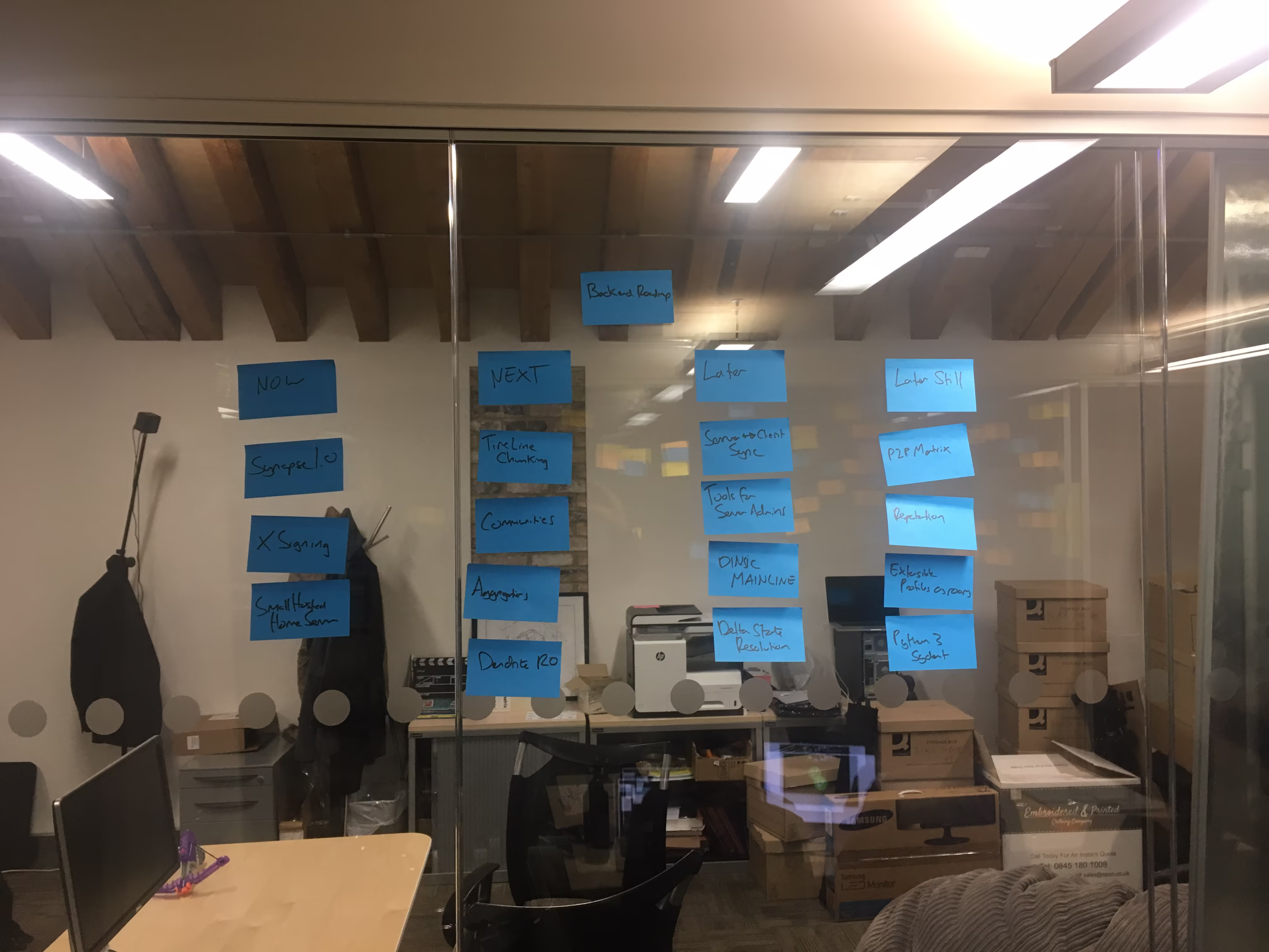 In the end we filled a wall with post-its, each post-it representing a sizeable project. The position of the post-it was significant in that the vertical axis being a sense of how valuable we thought the task would be, and the horizontal axis being a rough guess on how complex we considered it to be.