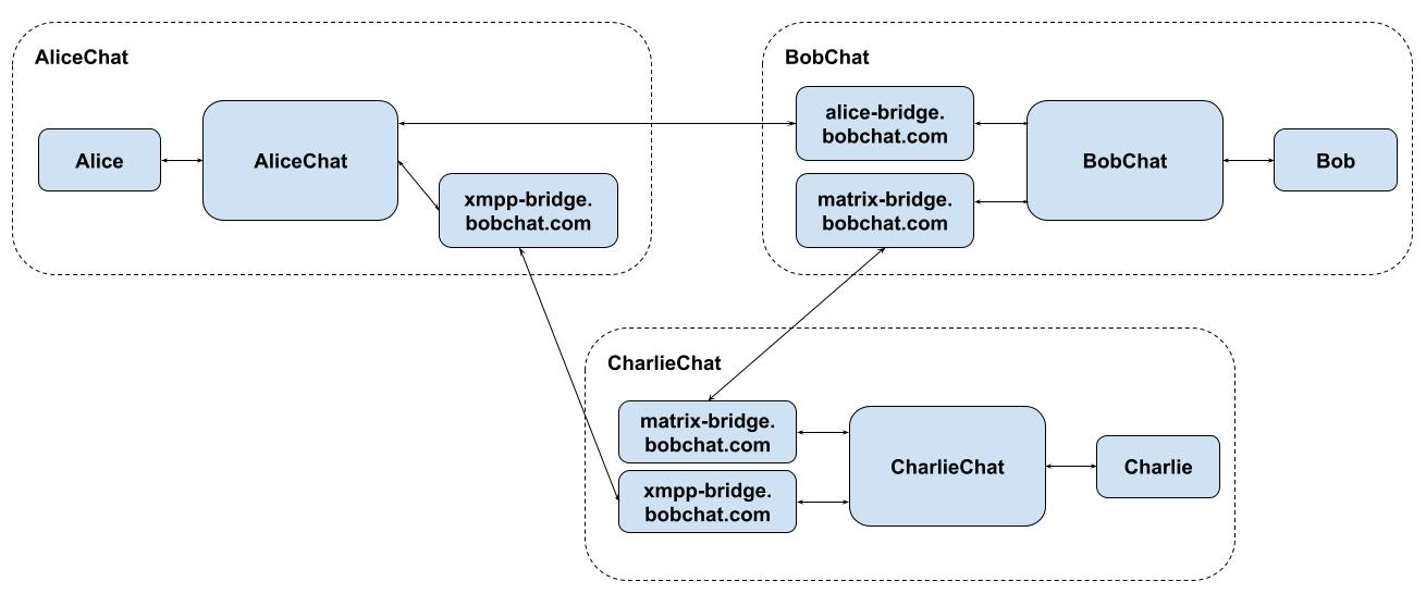 In this thought experiment, the bridge used would be up to the destination provider. For instance, bobchat.com could announce that AliceChat users should connect to it via alicechat-bridge.bobchat.com using the AliceChat protocol(or matrix-bridge.bobchat.com via Matrix or xmpp-bridge.bobchat.com via XMPP) by a simple HTTP API or even a .well-known URL. Users might also be able to override the bridge used to connect to them (e.g. to point instead at a client-side bridge), and could sign the advertisement to prove that it hadn’t been tampered with.