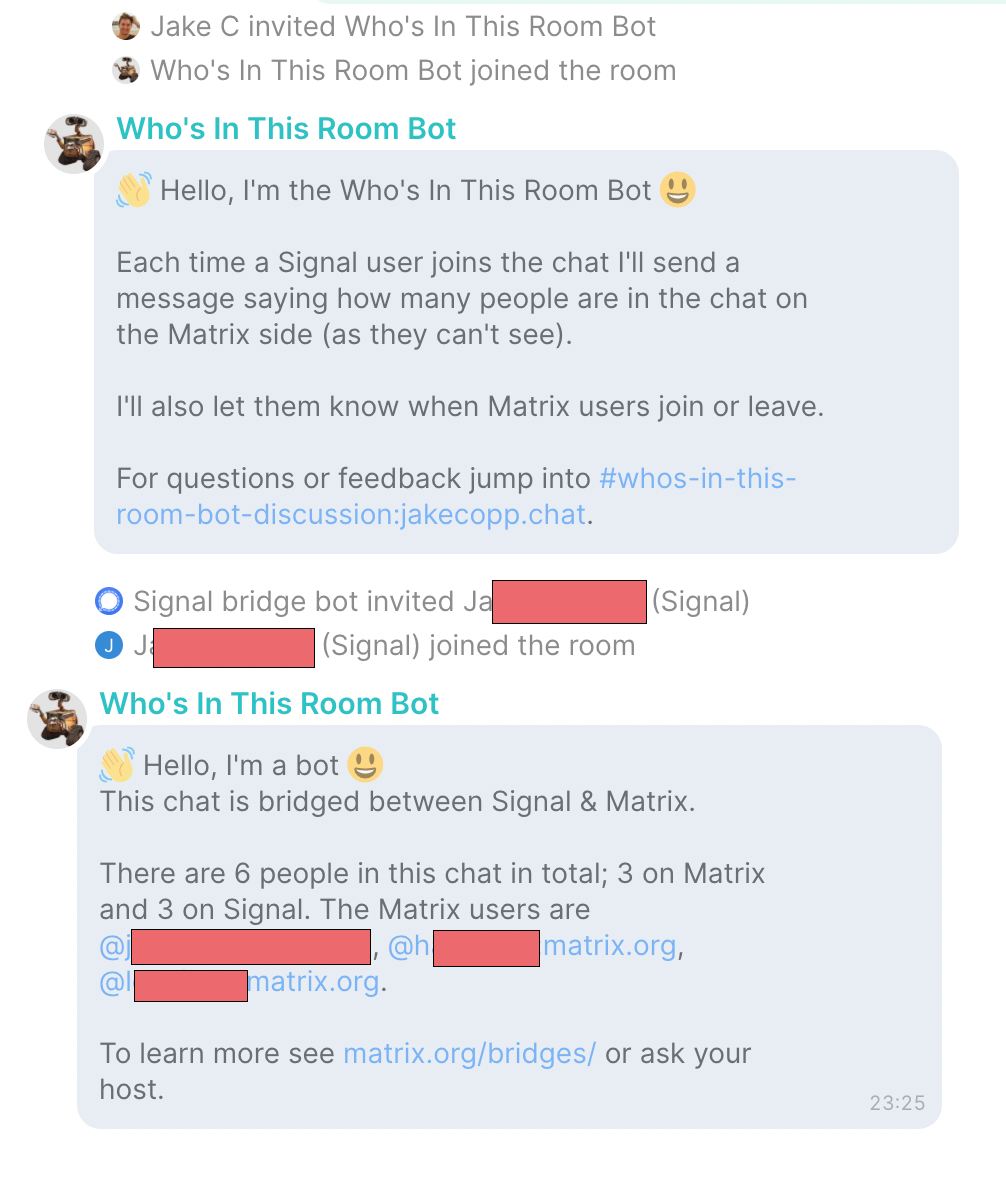 If you use Matrix with the Signal bridge (or any bridge) with relay mode enabled, your guests have probably experienced the confusion where they don't know who else (on Matrix) is in the chat as only Matrix can double-puppet.